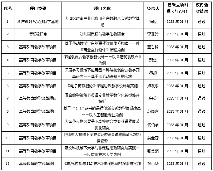 结合专家组评审意见,共有“大湾区时尚产业化应用科产教融合实践教学基地”等12个项目通过校内结题验收,现将结果进行公示,详见下表。