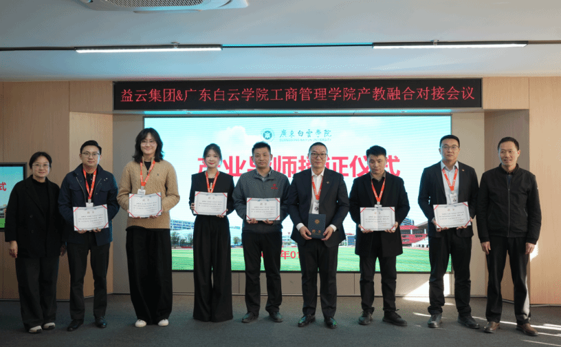 随后,现场举行了简洁而庄重的校企合作签约仪式,广东白云学院工商管理学院与益云集团、康容实业、圣莎拉集团三家企业正式签署合作协议,标志着校企合作进入制度化、常态化新阶段。紧接着,学院领导为企业代表颁发了企业导师聘书,聘请肖昭栋、曾彩婷、杨际广、王琳等八位行业专家担任产业导师,为学生带来一线实践指导。